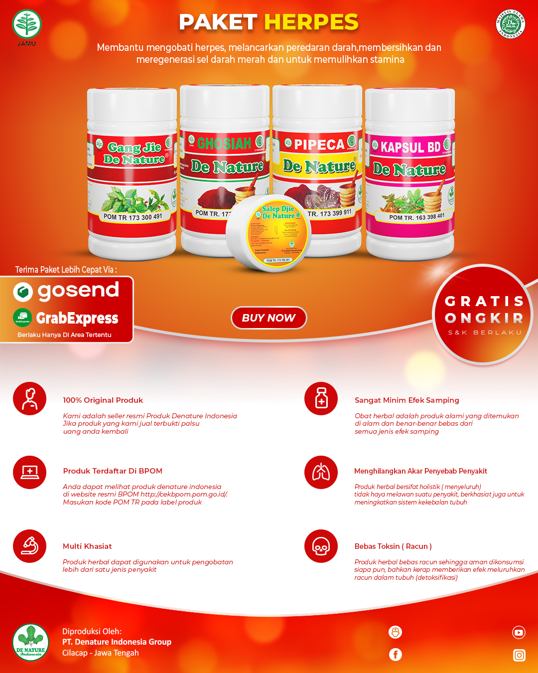 Gang Jie, Gho Siah, Pipeca, Bersih Darah, dan Salep Djie merupakan komposisi tepat dan cepat untuk menyembuhkan penyakit herpes.Obat ini dapat menetralisir virus penyebab penyakit herpes dengan cepat dan aman tanpa efek samping. Obat Herbal De Nature terbuat dari 100% bahan herbal Asli , Jadi lebih mudah di serap tubuh , dan langsung mengobati sumber penyakit.