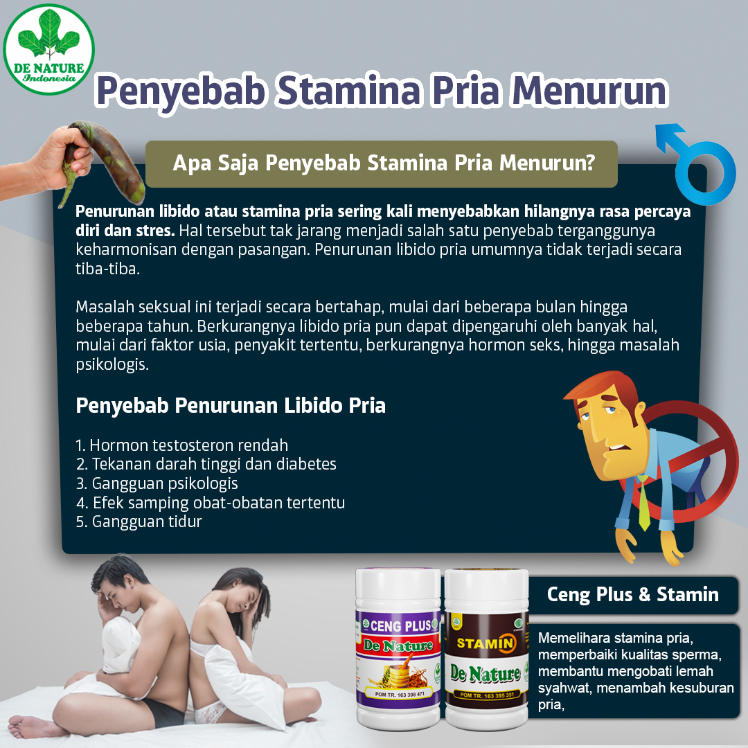 Kapsul Stamin dan Ceng Plus De Nature merupakan paket Ekslusif khusus pria dewasa, dibuat dari bahan herbal berkhasiat yang proses secara modern. Herbal ini sudah terbukti dan teruji secara klinis oleh ahli farmasi, dan menyatakan bahwa Stamin dan Ceng Plus De Nature lebih bagus dan 100% aman dari pada produk lainnya yang menggunakan bahan kimia.